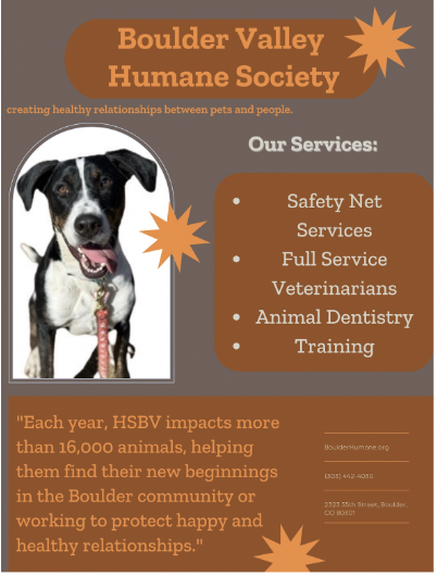 There are many incredible resources the HSBV provides, but a majority of the public is only aware of their adoption center. A lack of awareness of these resources leads to a direct lack of usage. According to our team's research, 82.7 % of the community of Boulder Valley knows about the Humane Society, yet most are unaware of all the other unique and valuable services they provide at this specific location, such as their training center, veterinary clinic, and safety net services. These services are in place to specifically help pets and pet owners alike; however, they can not be helpful if community members are unaware of them. After conducting a survey with community members, only 23.1% of them knew about the full veterinary clinic, and only 1.9% were aware of the dentistry services provided at this facility. These are just a few examples of the incredible services the Boulder Humane Society provides, in addition to many others. Overall, our data concludes there is an extreme lack of awareness about other resources HSBV has in place to better serve the pets and pet owners of the Boulder community. Through this campaign, we want to educate the public about how the Boulder Valley Humane Society can help pet owners and their furry friends lead loving, fulfilling life.